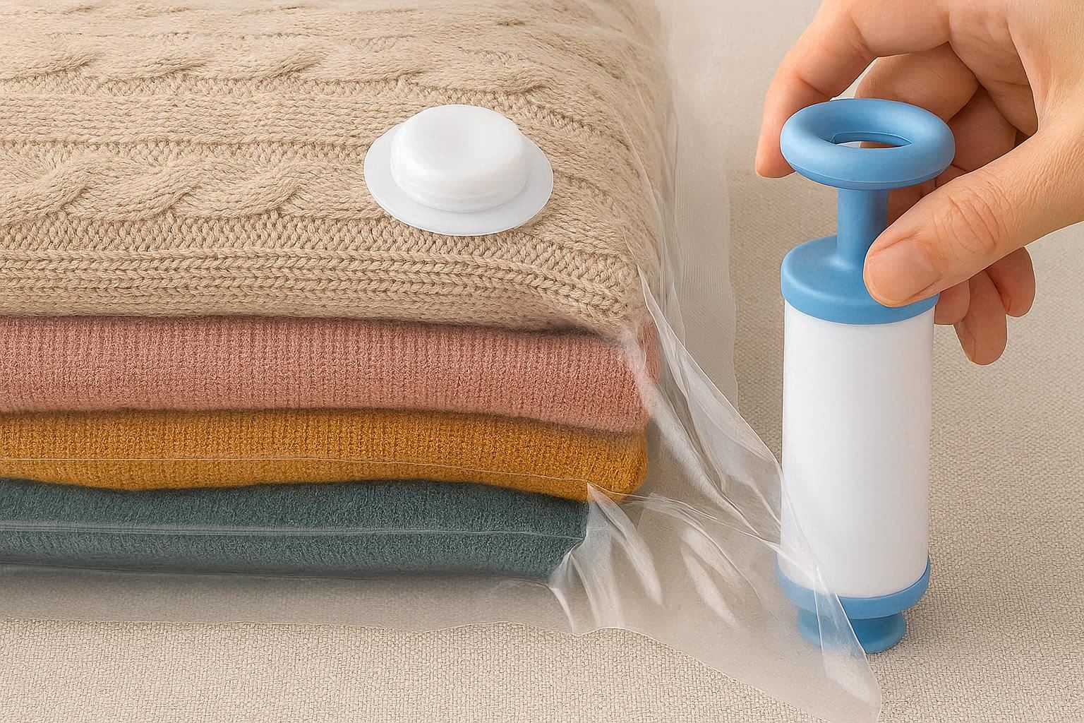 These heavy-duty bags are designed to work with a standard vacuum cleaner (no pump required). Made from thick, multi-layered polyethylene plastic with a textured surface to prevent punctures, they feature a patented one-way valve seal. You simply fill the bag with bulky seasonal clothing like winter coats, blankets, or bedding, seal the zipper, and attach your vacuum hose to the valve to suck out all the air, compressing items to a fraction of their original size.